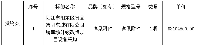 广东业信采购招标有限公司受 阳江市阳东区食品集团东城有限公司 的委托,于2025年9月17日就 阳江市阳东区食品集团东城有限公司屠宰场升级改造项目设备采购(项目编号:YXCG-20250826)采用公开招标方式进行采购。现就本次采购的中标结果公告如下: